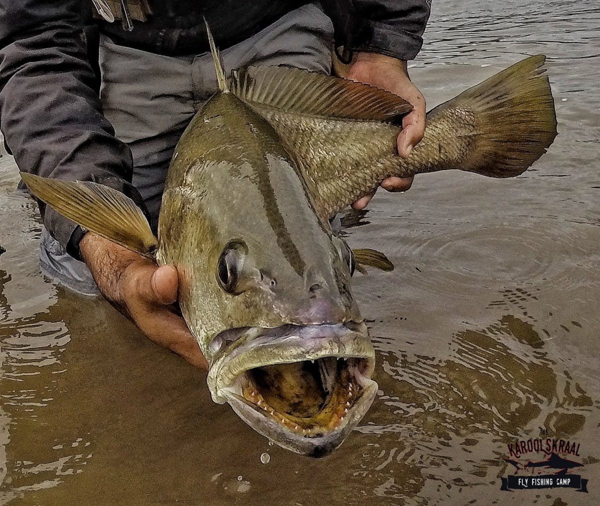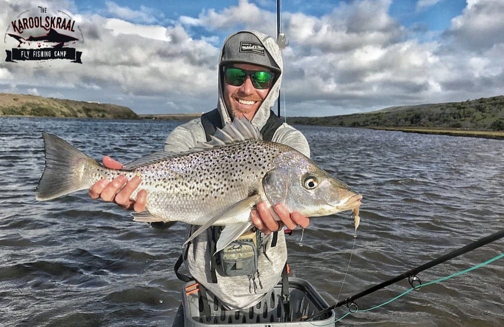Karoolskraal offers a perfect combination of diverse and challenging fishing conditions, very good fish stocks and privacy. Our fishing safari camp allows exclusive access to walk the banks and rock shelves in front of the camp, where we often have grunter tailing and garrick chasing mullet. Deep water for kob is accessible off rocky points, allowing fly fishermen the chance to catch a 1 m+ kob on fly from land!